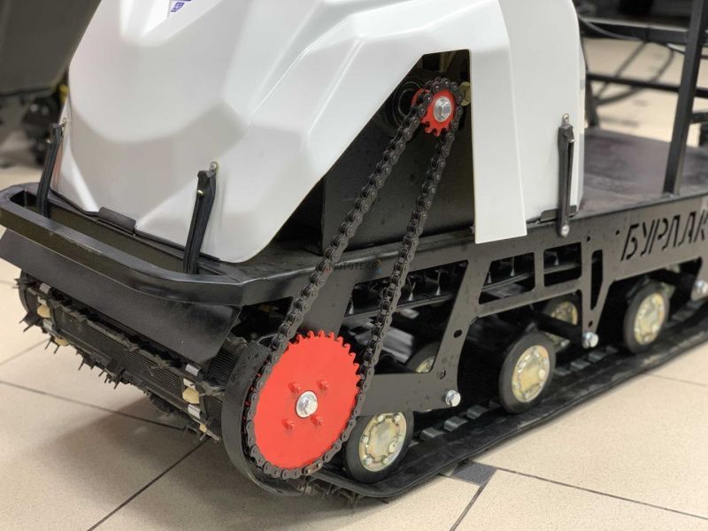 Рама мотобуксировщика Бурлак-М2 LFK выполнена из стали конструкционных марок, что повышает жесткость и прочность всей конструкции. Также обновлен кронштейн трансмиссии и дизайн капота. Для защиты от вылетающего снега из-под гусеницы установлен металлический отбойник. Теперь подвеска стала взаимозаменяемой, можно установить склизовую, катковую подвеску или пневмоколеса без внесения изменений в конструкцию.